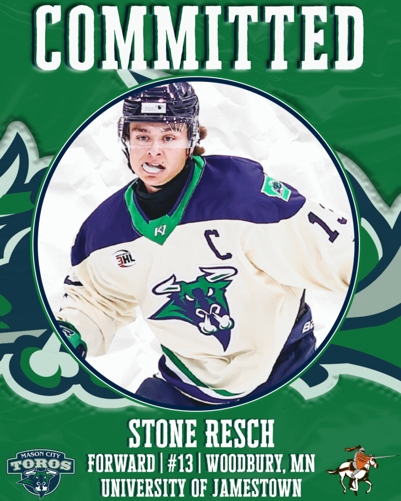 Mason City, IA- Mason City Toros forward & Captain Stone Resch has committed to play college hockey at the University of Jamestown, in Jamestown, North Dakota.